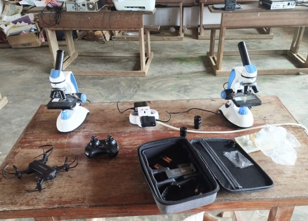 Salle d’informatique pour la circonstance tenant lieu de salle de correction. Les enfants pouvaient y faire un tour pour découvrir les microscopes, drone, matériel informatique et les ballons de football en passant par les œuvres d’art réalisées par nos apprenants.